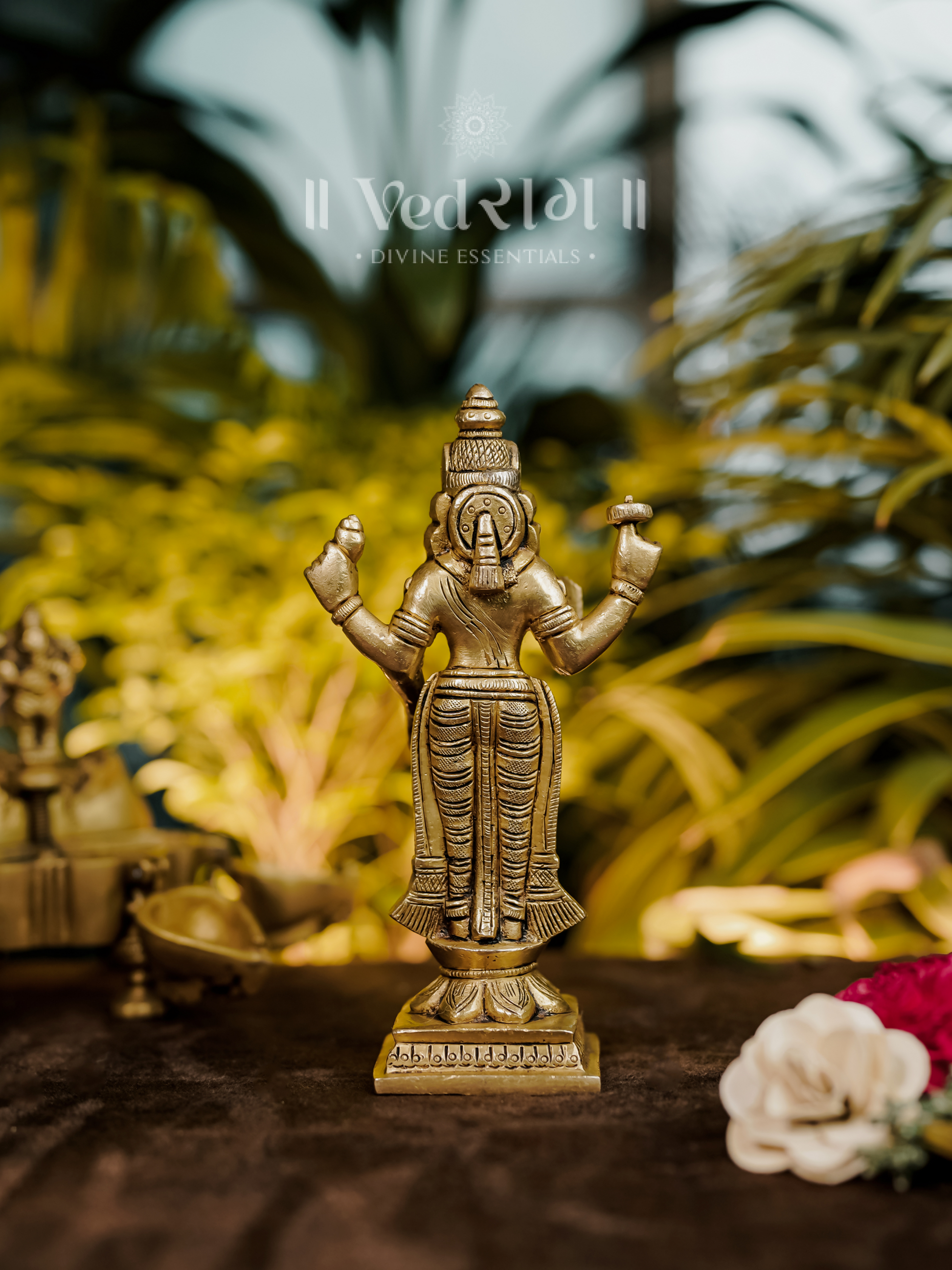This intricately handcrafted brass idol showcases Lord Vishnu in his classic form, holding the conch, discus, mace, and lotus, each symbolizing his divine attributes of righteousness, power, and protection. The detailed craftsmanship, from the intricate carvings on his crown to the graceful posture, reflects the rich tradition of Indian metal artistry.