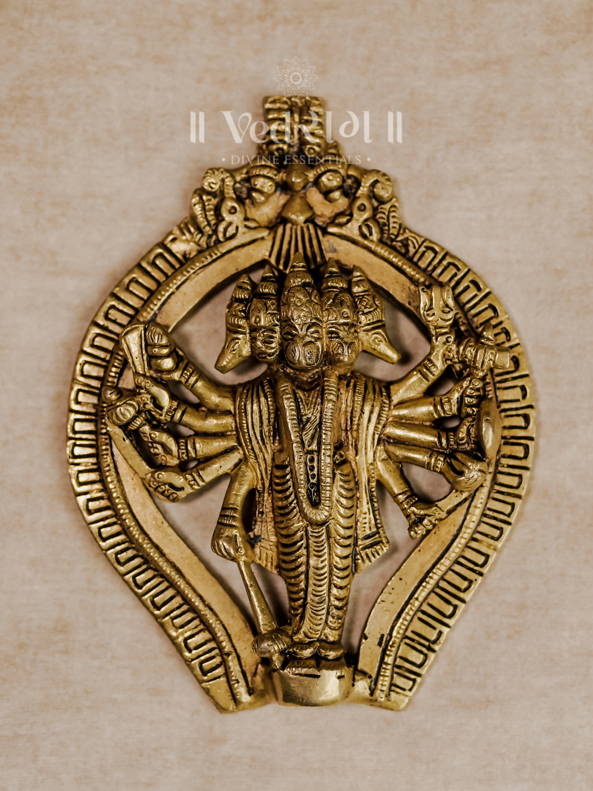 The "Panchmukhi Hanuman Wall Hanging" is a powerful depiction of Lord Hanuman in his five-faced form, symbolizing strength, protection, and unwavering devotion. Each face of Panchmukhi Hanuman represents a different aspect of his divine power: Lord Hanuman for courage, Narasimha for protection, Garuda for fearless flight, Varaha for victory, and Hayagriva for knowledge.